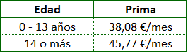 • Oferta extensible a cónyuge e hijos (residentes en el mismo domicilio que el titular de la póliza). Condición de «sin preexistencias», sujeta a alta en la misma fecha que el titular de la póliza. Prima asegurado / mes (0 – 13 años, 38,08 € ; 14 – 65 años, 45,77 €)